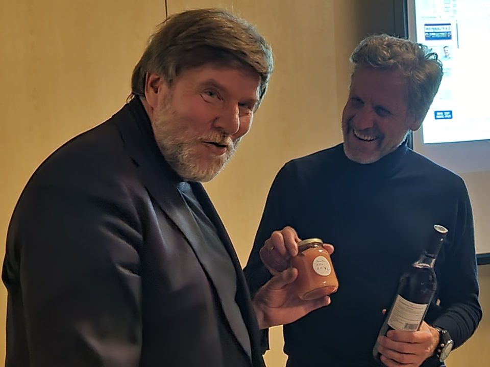 Markus Rösler überreicht Berthold Reichle ein GastgeschenkVöllig neue Wege geht Martin Linser, Leiter des Kompetenzzentrums Weinbau 4.0 bei der Wirtschaftsförderungsgesellschaft des Kreises Emmendingen. Die Agri-Photovoltaik (PV) sei eine innovative Methode, um die Erzeugung landwirtschaftlicher Produkte mit der Solarstromproduktion zu verknüpfen. „Dies ermöglicht eine Doppelernte“, sagte der Vizepräsident des Badischen Landwirtschaftlichen Hauptverbandes.