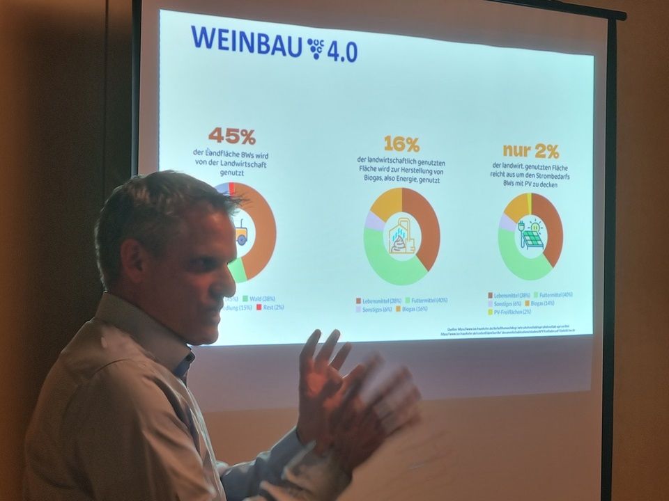 Die Solarmodule werden entweder hoch aufgeständert oder als bodennahes System in den Rebhängen eingesetzt. Bislang gibt es vier bestehende Anlagen, um die Wirksamkeit zu testen. Erste Erkenntnisse gibt es bereits: „Die Verschattung durch die Module reduziert die Wasserverdunstung darunter. Das wiederum kann den Bewässerungsbedarf der Reben um bis zu 20 Prozent senken“, bilanzierte Zinser. Seiner Meinung nach ist die Agri-PV eine Chance für die Zukunft. Nur 2 Prozent der landwirtschaftlich genutzten Flächen würde ausreichen, um den Strombedarf Baden-Württembergs mit PV zu decken, rechnete Martin Zinser vor.